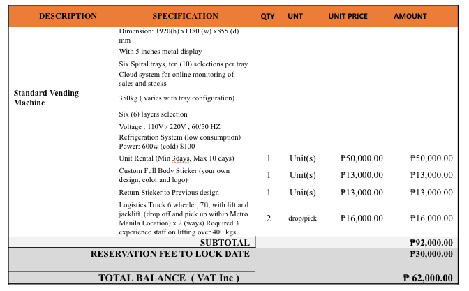 Full payment must be settled upon delivery of the vending machine to the event location, prior to demonstration or setup.