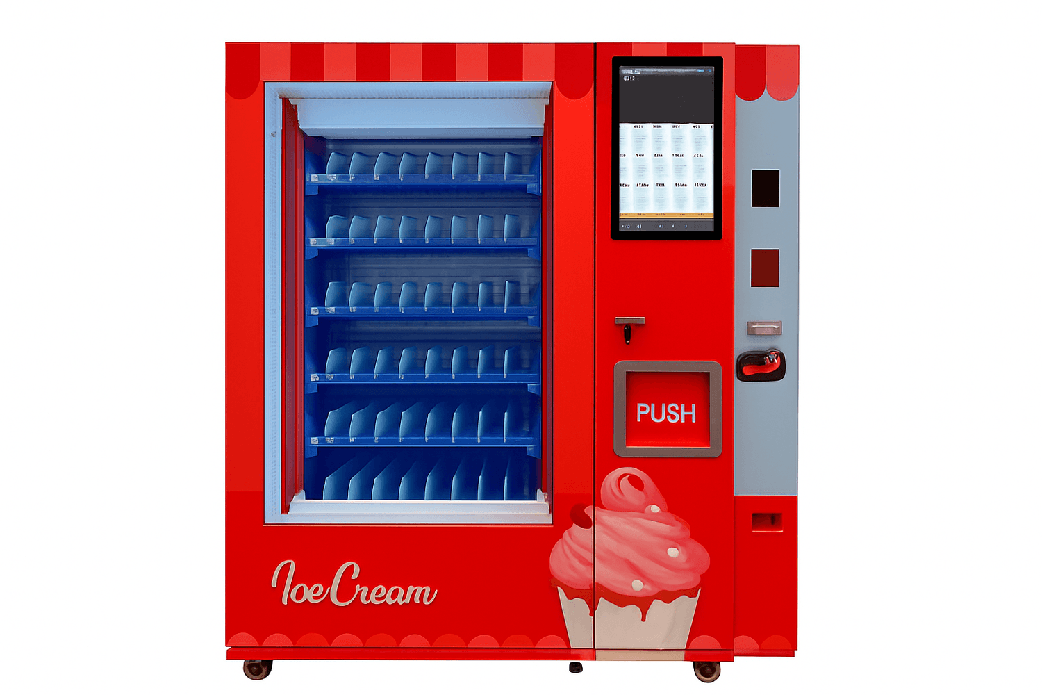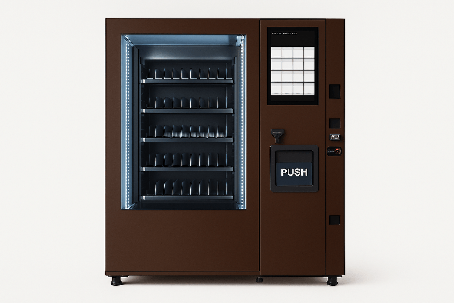 On-hand vending machines cannot be customized; tray configuration is standard for drinks and snacks. Only the sticker design with logo and branding can be customized.